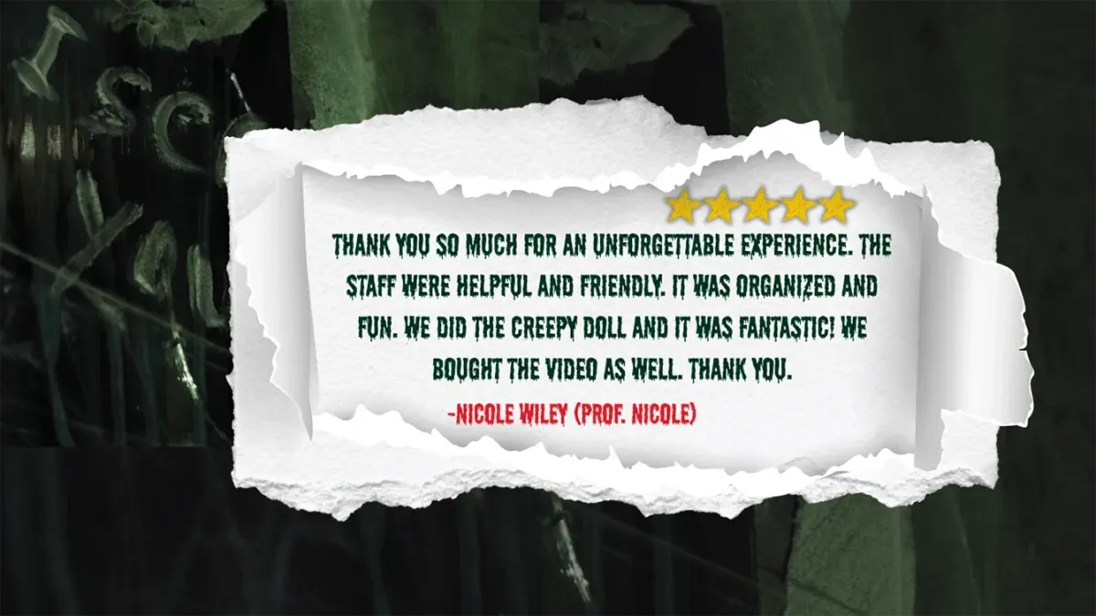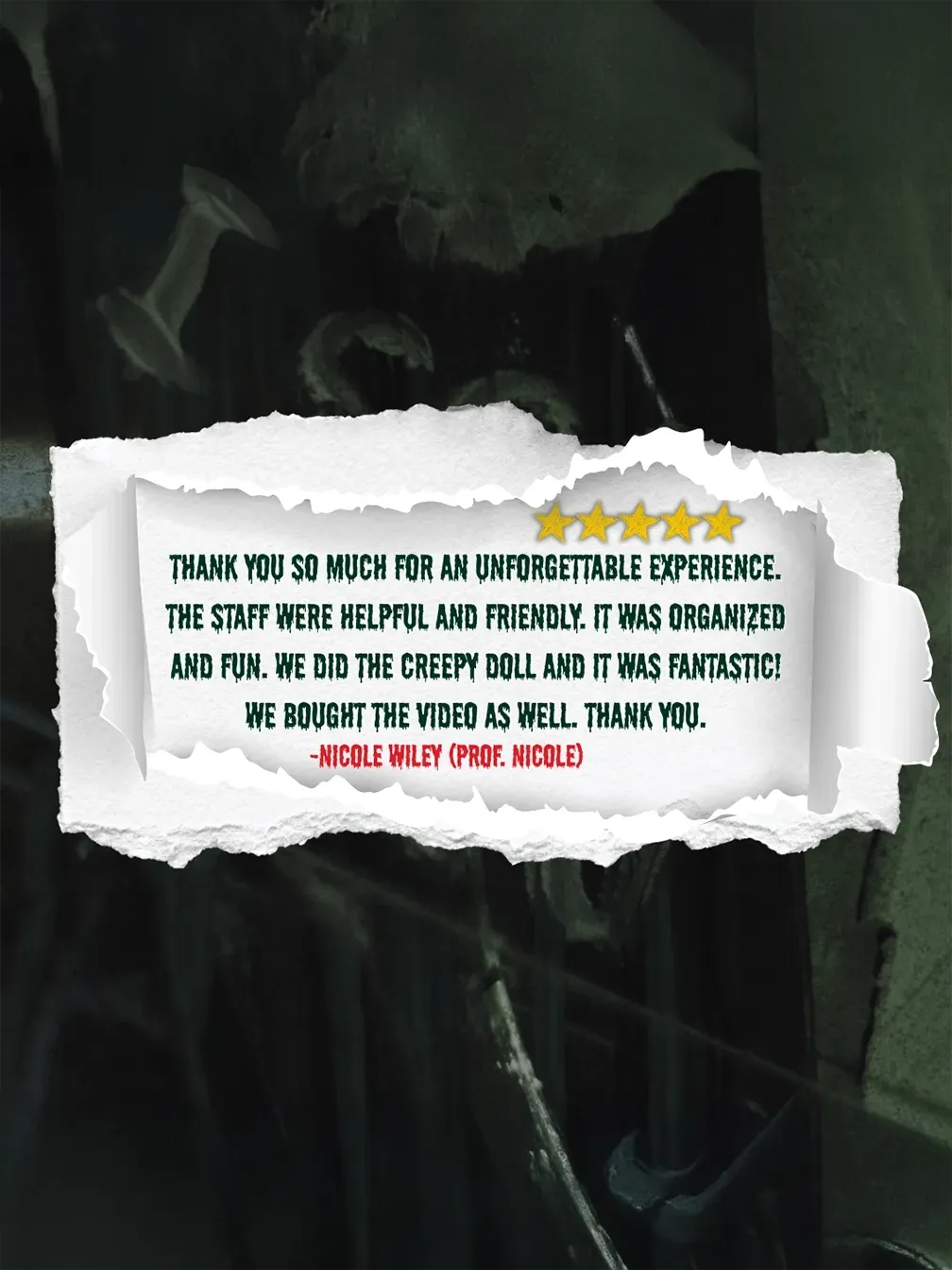Thank you so much for an unforgettable experience. The staff were helpful and friendly. It was organized and fun. We did the creepy doll and it was fantastic! We bought the video as well. Thank you.